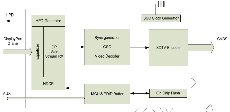 With sophisticated MCU and the Boot ROM embedded, CH7523 support auto-boot and EDID buffer. After the configuration by firmware, which is auto loaded from Boot ROM, CH7523 can support DP input detection, TV connection detection and determine to enter into Power saving mode automatically.